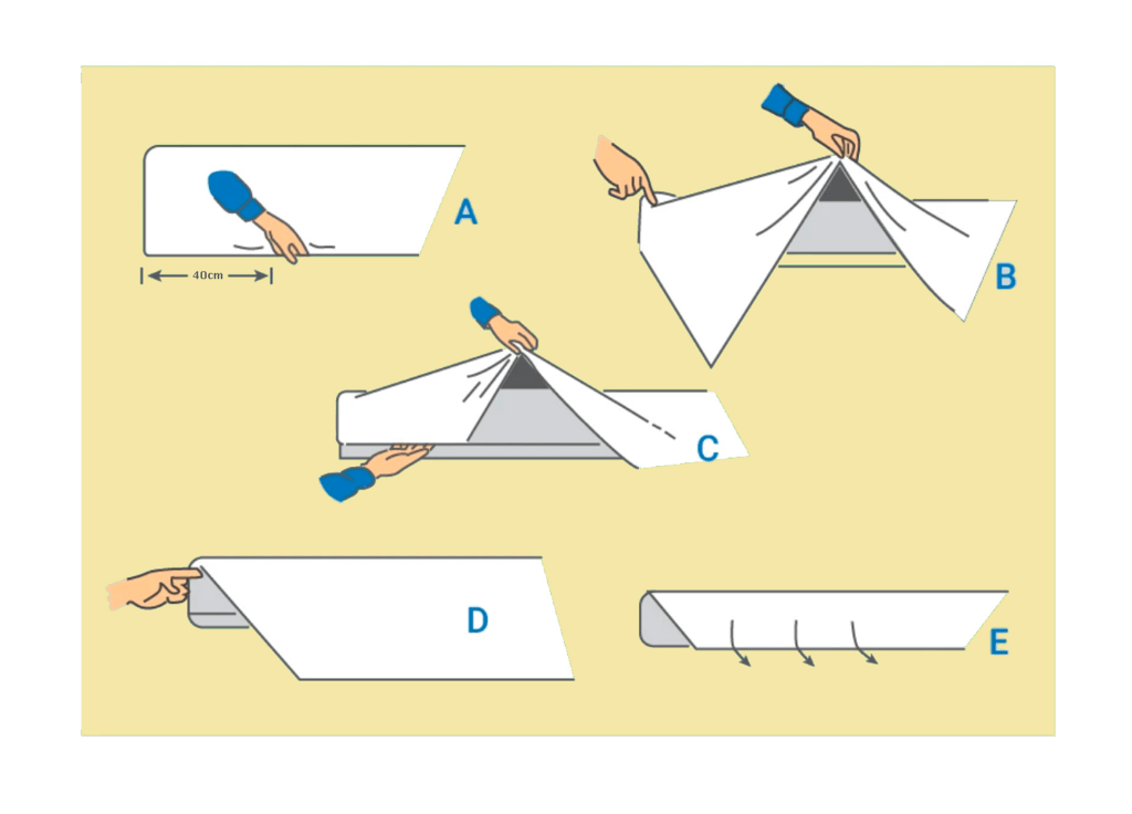 Este método recibe el nombre de «Hospital Corner» y consta de 5 pasos: